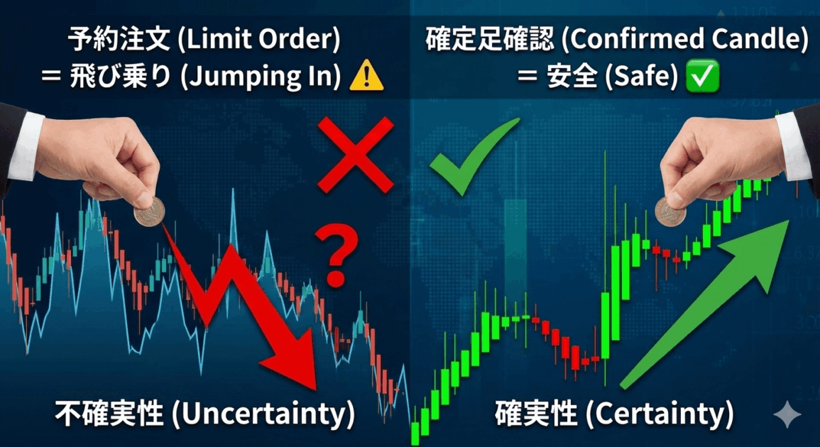 私の手法では、基本的に指値での予約注文は推奨しません。「ここまで来たらエントリー」という予約は、一見便利ですが、実は**「どこまで逆行するか分からない中での飛び乗り」**と同じだからです。