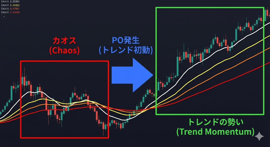 画像左側の**赤い枠(カオス)を見てください。4本の線が絡み合い、順番がバラバラになっています。私はこれを「スパゲッティ状態」と呼んでいます。ここではどんな天才でも勝率は安定しません。規律あるトレーダーがすべきことは、ただ一つ。「何もしないこと」**です。