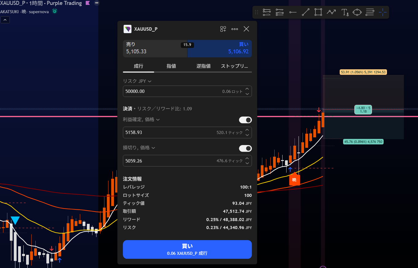多くのトレーダーがロット計算に時間を取られ、分析機会を逸したり計算ミスをしたりしますが、暁流ではTradingViewの機能をフル活用し、「許容リスク金額(JPY)」に基づいて論理的に注文を完了させます。