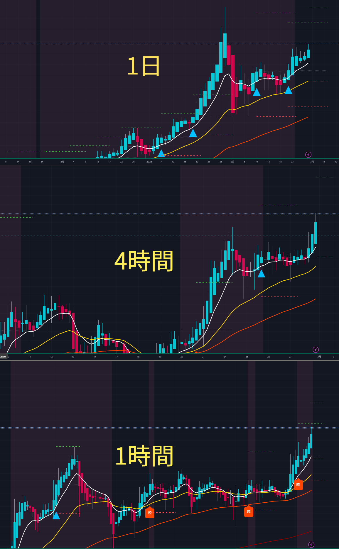 1時間足(1H)、4時間足(4H)、日足(1D)のすべてが同一方向(すべて買い、またはすべて売り)を示唆している対象を優先的に特定します。